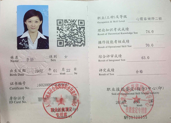 李扬律师荣获国家二级心理咨询师